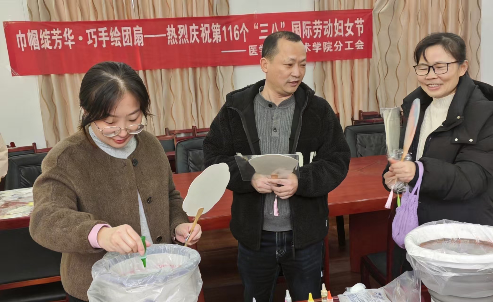 活动现场,女教师们暂时卸下繁忙工作,化身执笔“丹青手”,尽情挥洒创意灵感。平日里手执粉笔、操作精密仪器的双手,此刻在扇面上勾勒出兰竹的高洁、花鸟的灵动。一笔一画间,素白的团扇变得色彩斑斓,不仅流淌着对传统文化的敬意,更折射出新时代医学工程女性知性典雅、刚柔并济的独特风采与精神风貌。