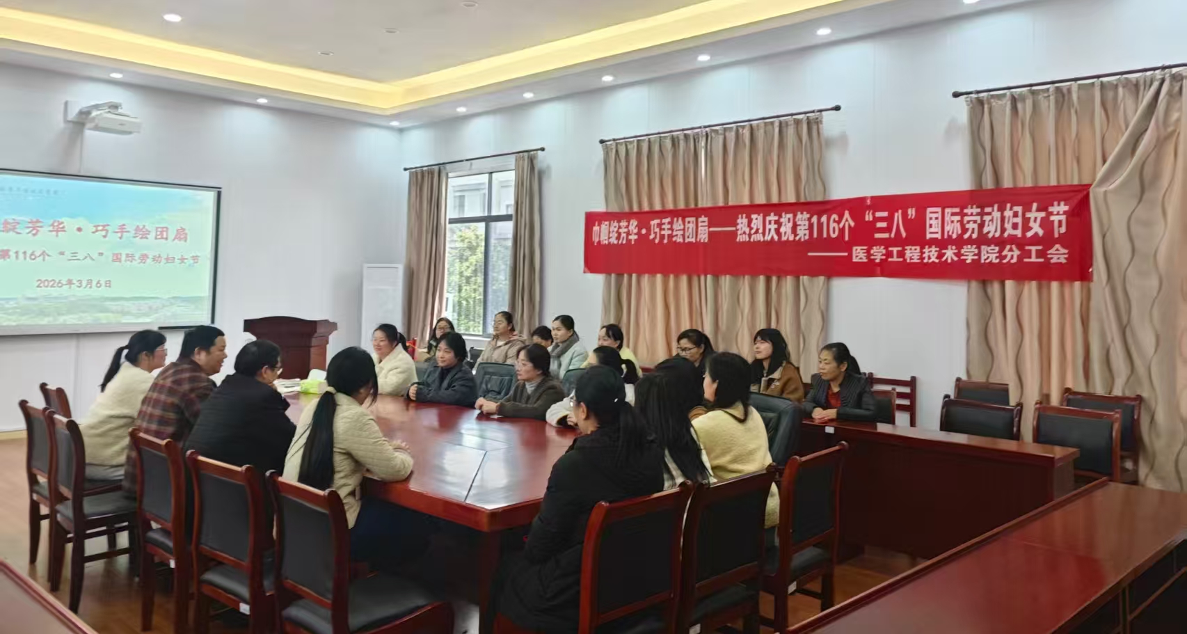 3月6日下午,医学工程技术学院407室内暖意融融,墨香四溢。为庆祝第116个“三八”国际劳动妇女节,弘扬中华优秀传统文化,学院精心组织开展了“巧手绘团扇,芳华绽校园”主题非遗团扇手绘活动。全体女教职工齐聚一堂,以笔传情、以墨抒怀,非遗技艺的体验中涵养文化底蕴,凝聚起推动学院发展的巾帼力量。
